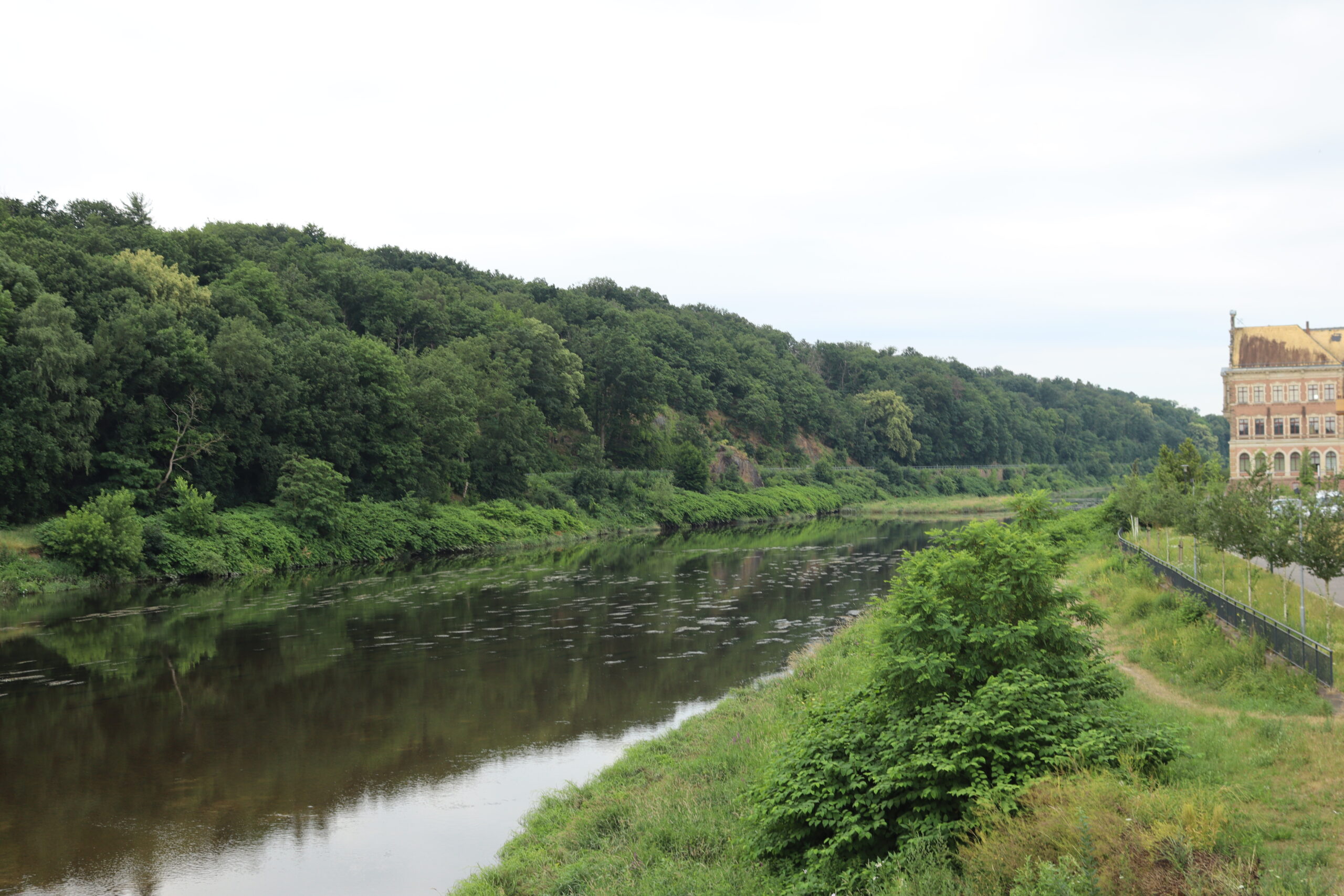 Vi havde overnattet på Altstadt Hotel "Garni", og ruten startede bogstaveligt talt lige uden for døren. Derfra gik vi gennem bymidten og krydsede den karakteristiske Pöppelmannbrücke, hvor udsigten ned mod Muldefloden satte den perfekte stemning for dagen – blødt morgenlys over stille vand og grønne træer på begge bredder.