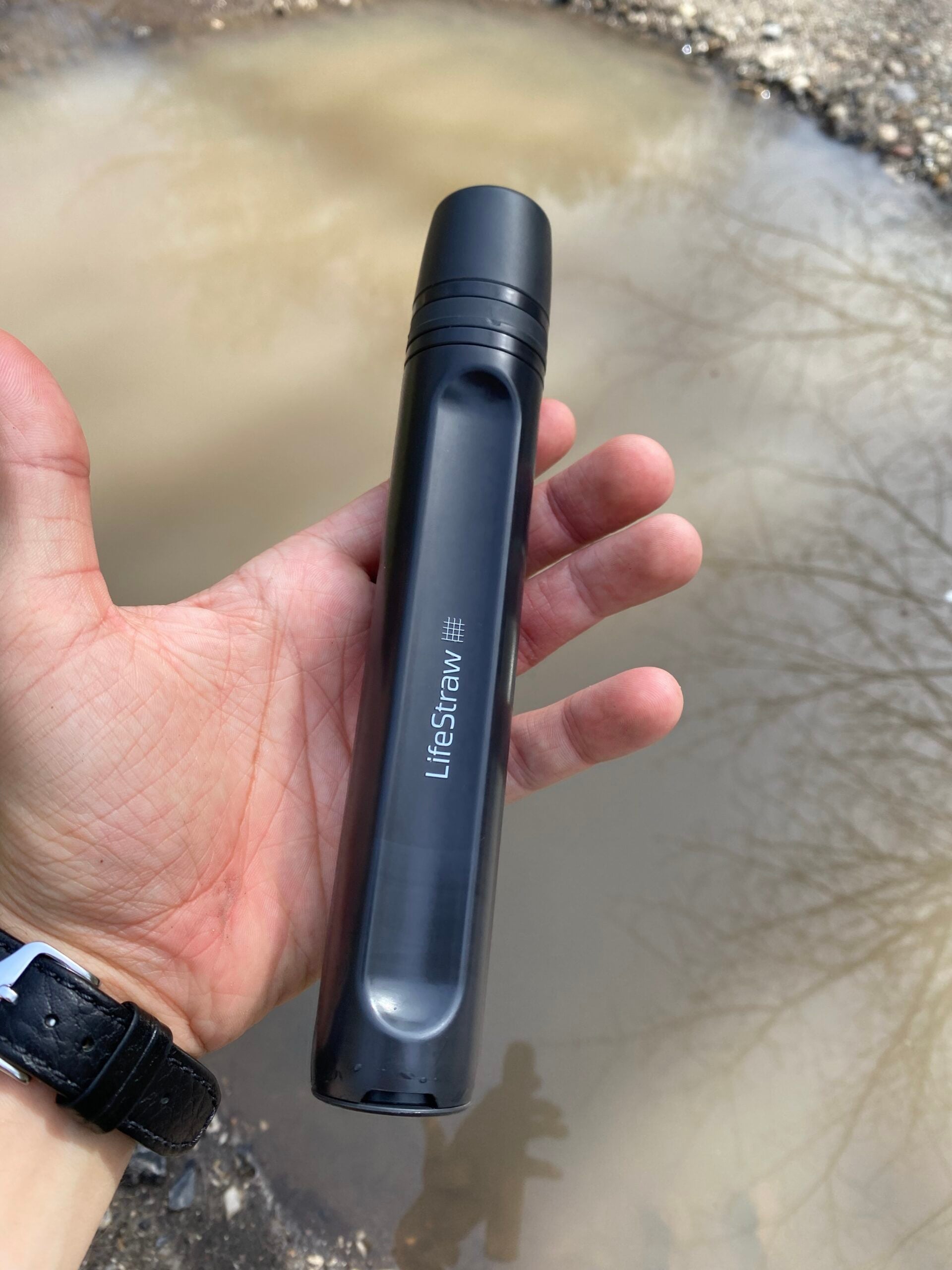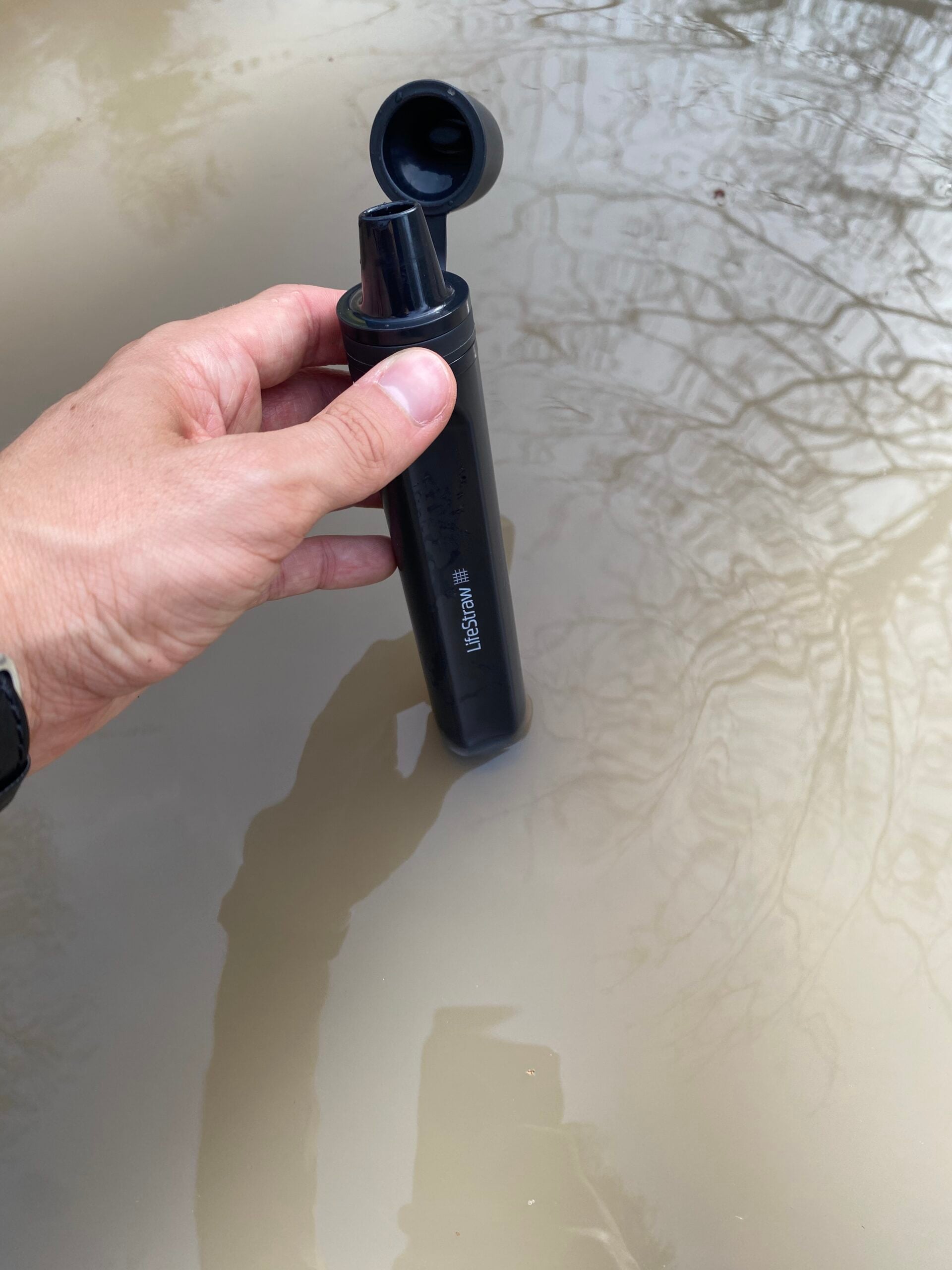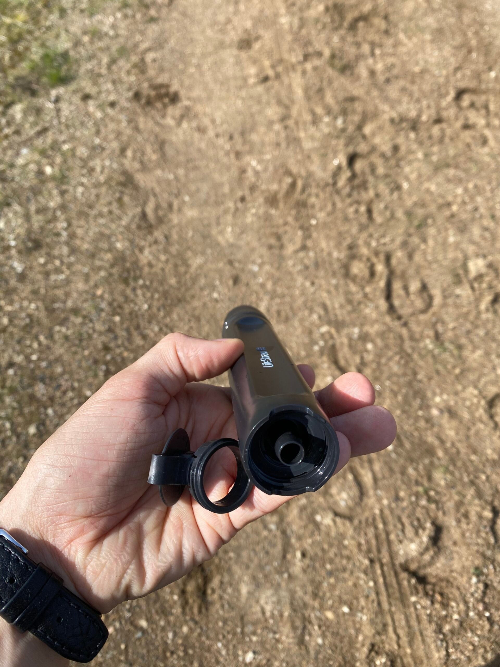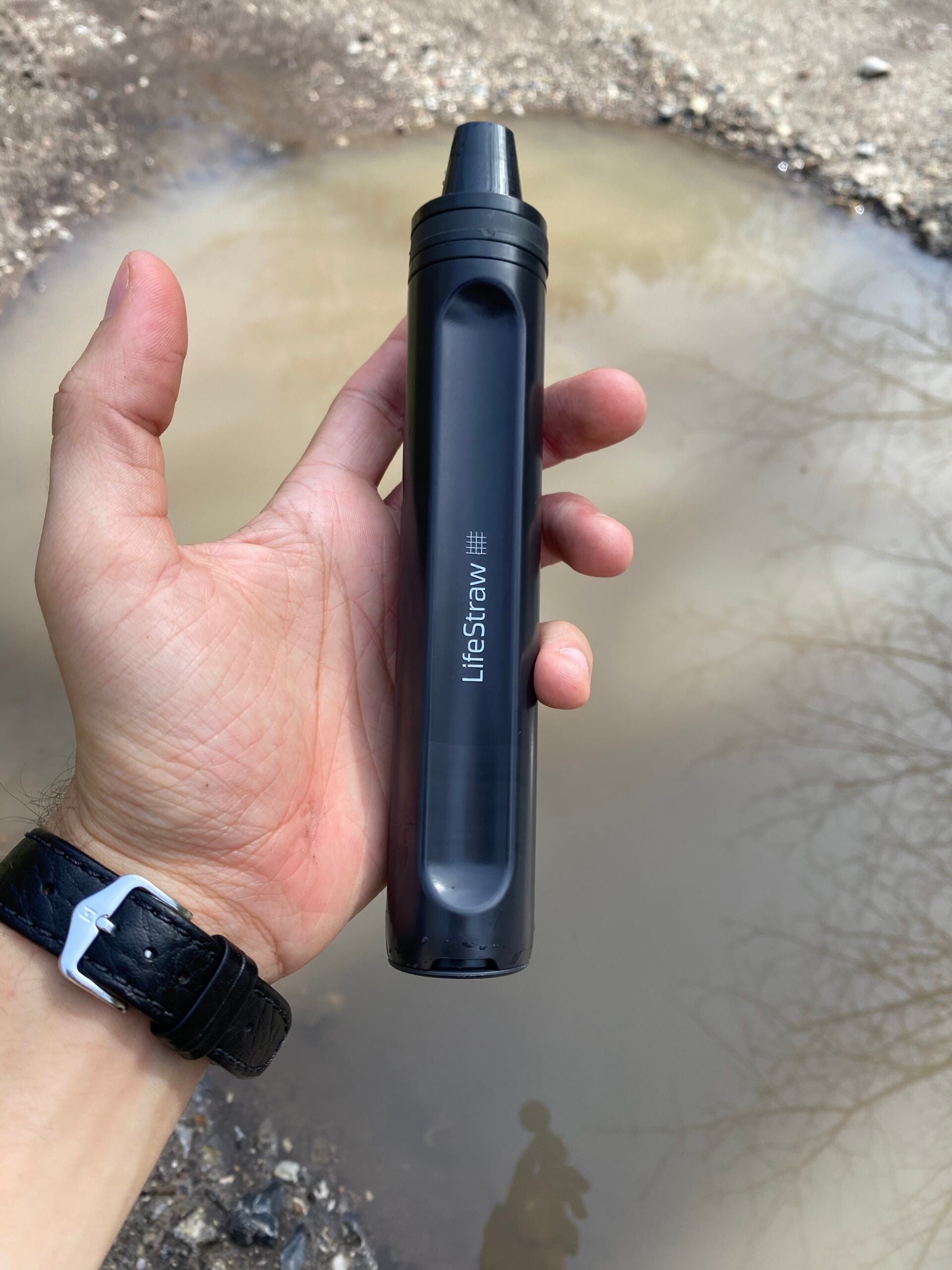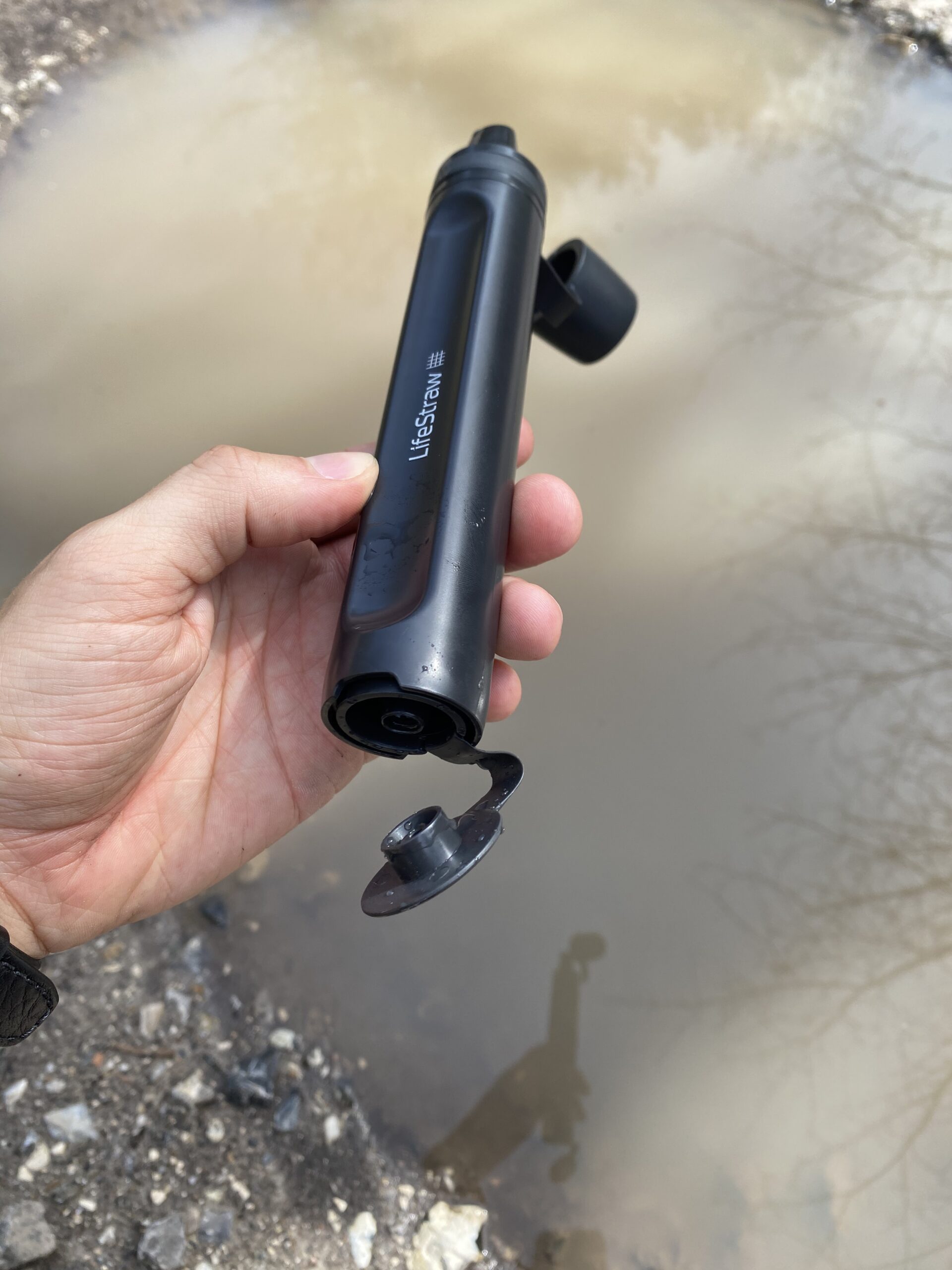 Jeg stak den blot ned i denne, forholdsvis mudret, vandpyt og begyndte at suge, indtil vandet kom ind i munden. Det smagte, overraskende nok, som helt klart og filtrerede vand - og det er også det unikke ved disse personlige vandfiltre fra Lifestraw - du kan drikke stort set alt slags vand, og så vil 99,99% af bakterier, parasitter, mikroplast, silt, sand og uklarheder forsvinde.