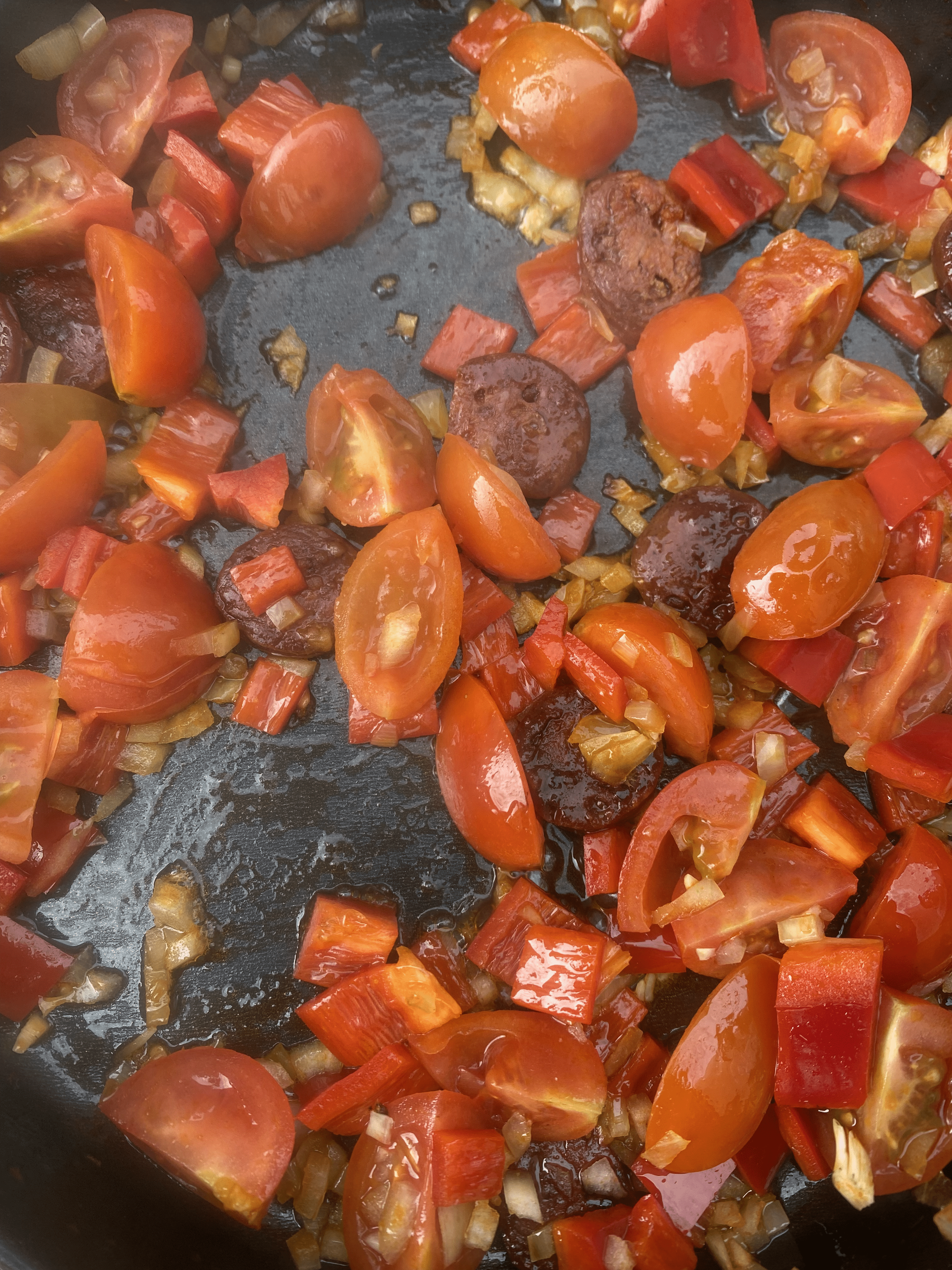 Forberedelse: Start med at hakke løg, tomat og peberfrugt på din tallerken. Skær også tynde skiver af chorizo og den hårde ost.